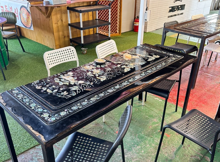 테이블이 남달라 보이는데 자개장의 문을 개조해서 만든 것이라 눈에 띄네요.