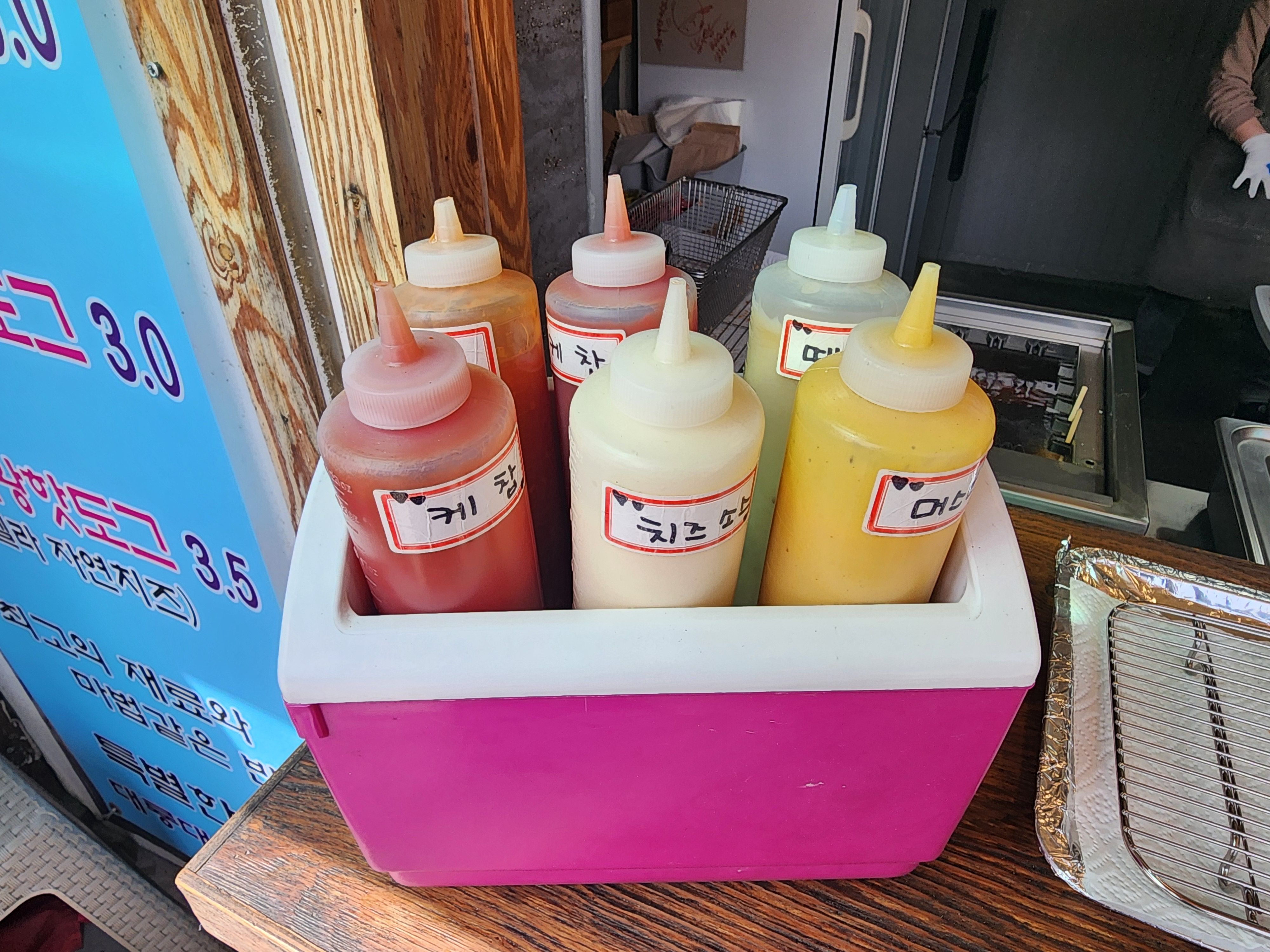 취향에 따라 소스가 여러 가지로 구비되어 있어서 뿌려먹는 맛이 일품입니다.