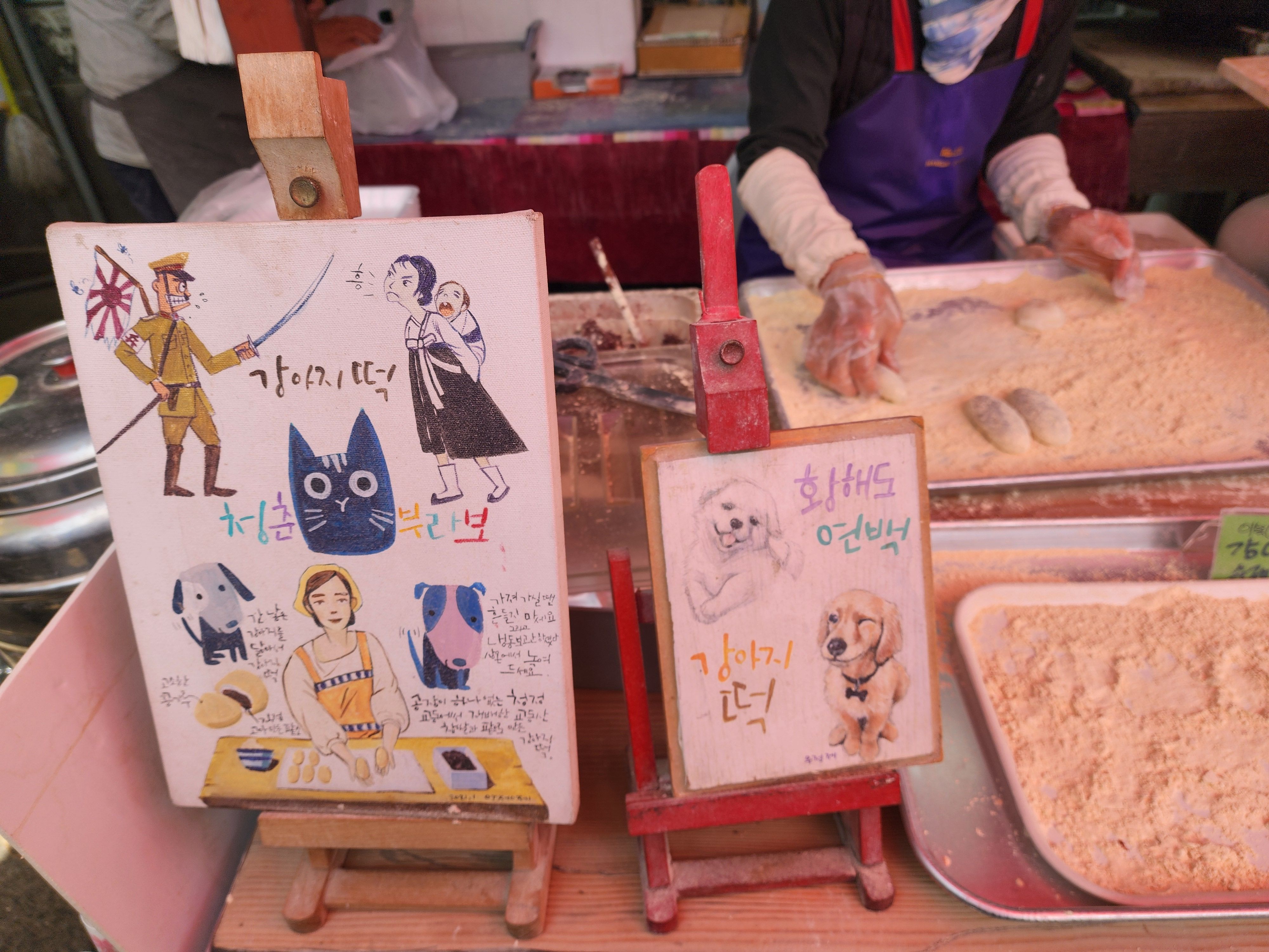 이때 일본인들의 눈을 피해서 자식들에게 먹일 인절미를 만들었는데 갓 낳은 강아지 모양의 떡이라 강아지떡이라고 이름 붙여서 만들었다고 하는 유래입니다.