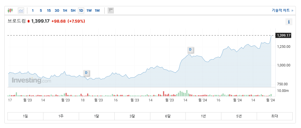 미국주식시장에서 브로드컴은 신고가를 갱신하며 3월 1일 7.59%가 상승한 1,399.17달러로 장 마감했습니다.